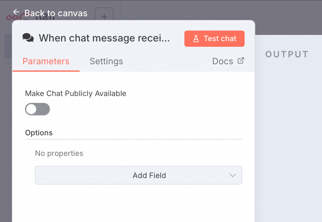 为了实现智能化的问答,接下来我们重新创建一个工作流,选择When chat message received节点,当收到输入框内容回车后触发。