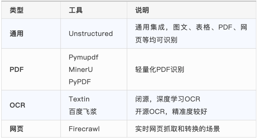 其中,Unstructured是目前较火的一种通用抽取工具,支持常见各种丰富的文档格式,适合作为一种基础通用的抽取工具选型。抽取阶段的难点其实在于——PDF和图片文字提取上。