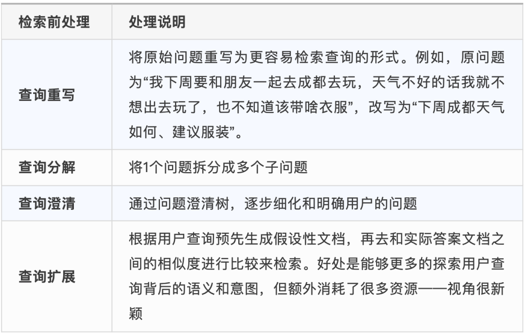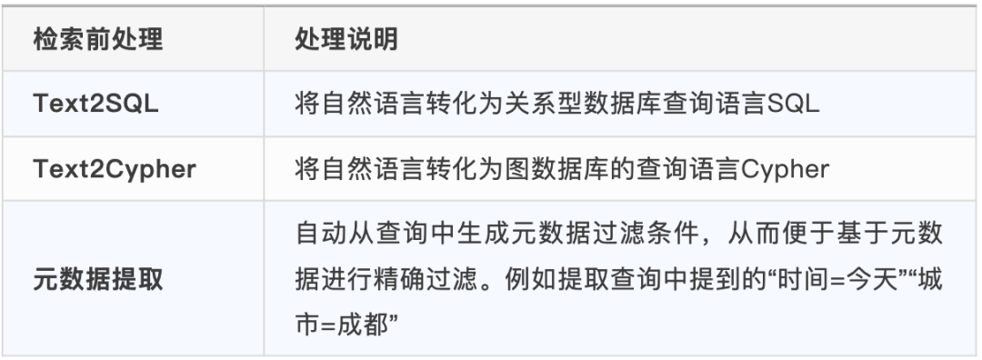 检索前,常见的处理方式有如下几种,其中查询结构转化和查询翻译是常用的一些检索前优化方式,查询路由应用相对没那么多: