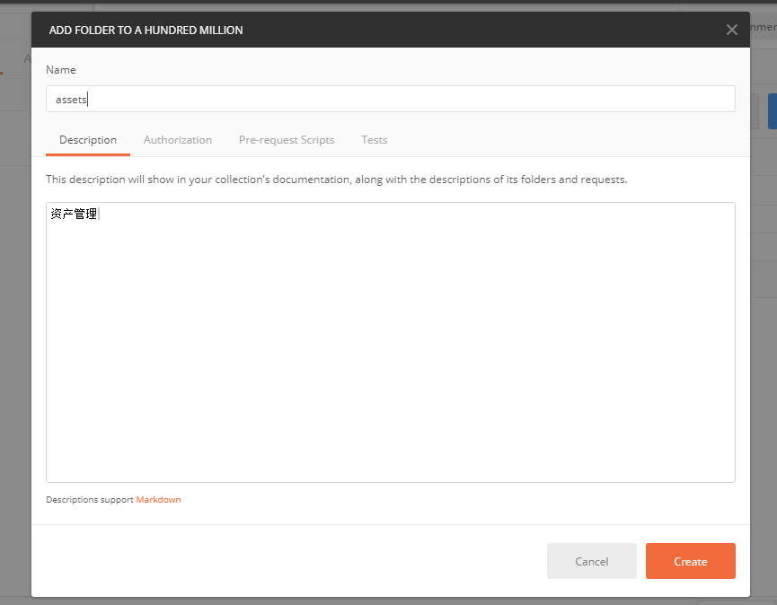 4、创建项目模块文件夹: 一般项目会分多个管理模块或者功能模块进行开发。这里可根据项目具体情况创建子文件夹方便接口管理。此处在A hundred million项目右键创建资产管理assets文件夹、user用户管理文件夹。可将测试的接口实例保存在对于管理模块下。