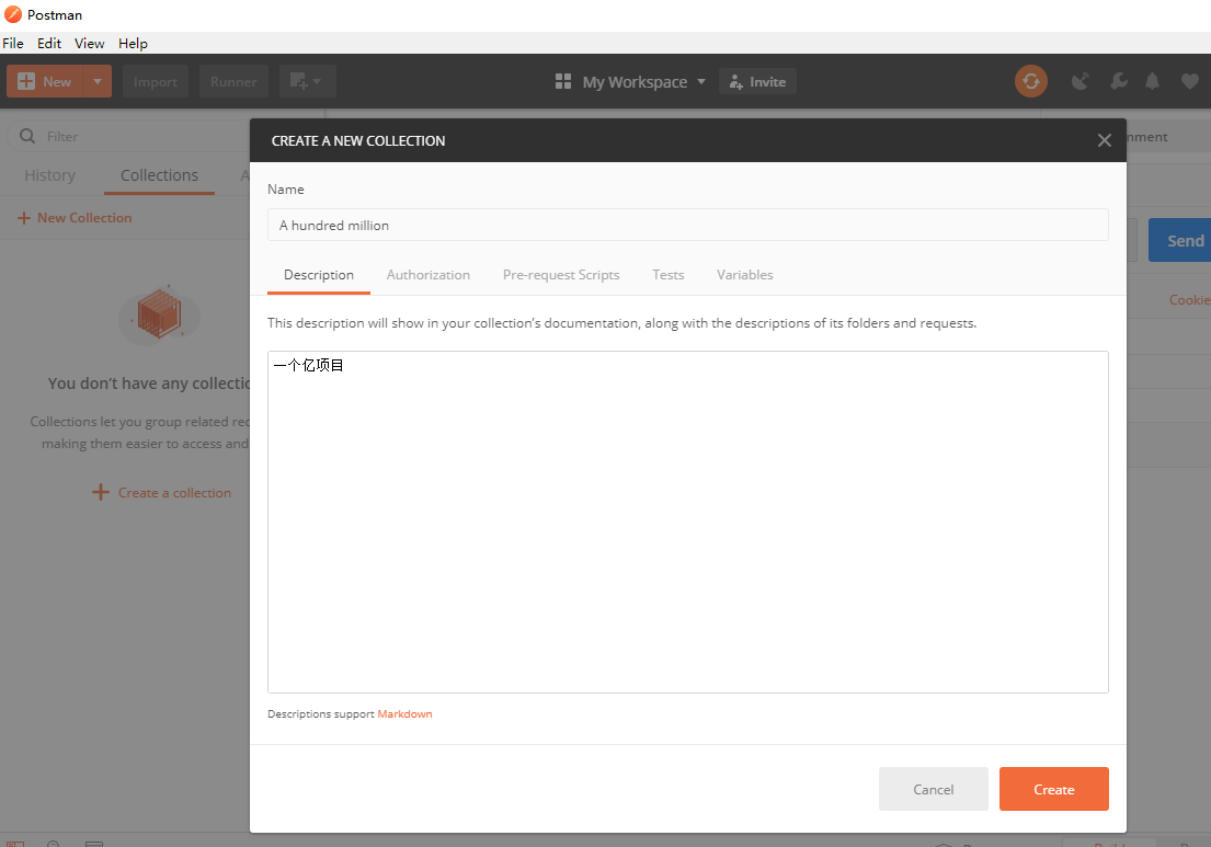 3、新建项目:选择功能菜单New下的Collection创建项目接口集合。新建一个项目,可在Description部分写一下项目描述。