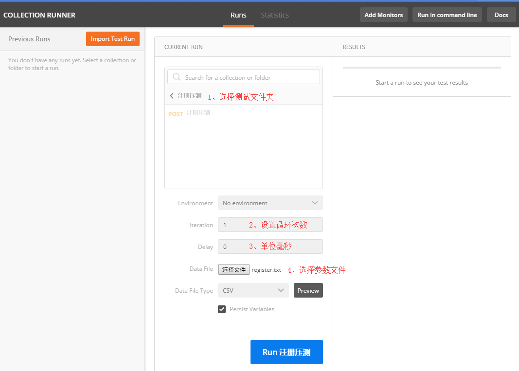 以csv格式数据为例(json格式数据只需要在导入测试数据时,选择json就可以):