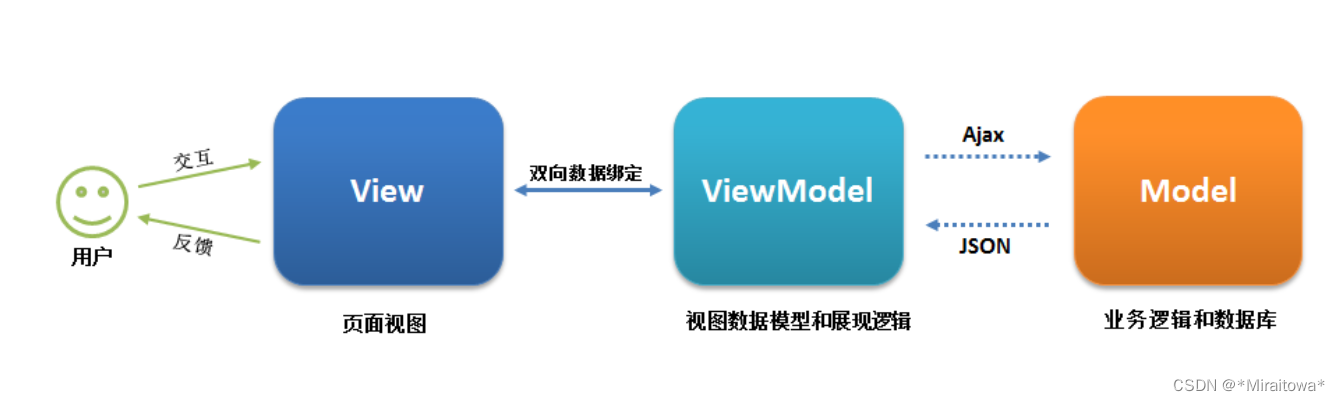 ViewModel 是由前端开发人员组织生成和维护的视图数据层。在这一层,前端开发者对从后端获取的 Model 数据进行转换处理,做二次封装,以生成符合 View 层使用预期的视图数据模型。需要注意的是 ViewModel 所封装出来的数据模型包括视图的状态和行为两部分,而 Model 层的数据模型是只包含状态的,比如页面的这一块展示什么,那一块展示什么这些都属于视图状态(展示),而页面加载进来时发生什么,点击这一块发生什么,这一块滚动时发生什么这些都属于视图行为(交互),视图状态和行为都封装在了 ViewModel 里。这样的封装使得 ViewModel 可以完整地去描述 View 层。由于实现了双向绑定,ViewModel 的内容会实时展现在 View 层,这是激动人心的,因为前端开发者再也不必低效又麻烦地通过操纵 DOM 去更新视图,MVVM 框架已经把最脏最累的一块做好了,我们开发者只需要处理和维护 ViewModel,更新数据视图就会自动得到相应更新,真正实现数据驱动开发。看到了吧,View 层展现的不是 Model 层的数据,而是 ViewModel 的数据,由 ViewModel 负责与 Model 层交互,这就完全解耦了 View 层和 Model 层,这个解耦是至关重要的,它是前后端分离方案实施的重要一环。