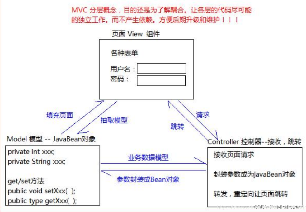 - 模型(Model):程序员编写程序应有的功能(实现算法等)、数据库专家进行数据管理和数据库设计(可以实现具体的功能);