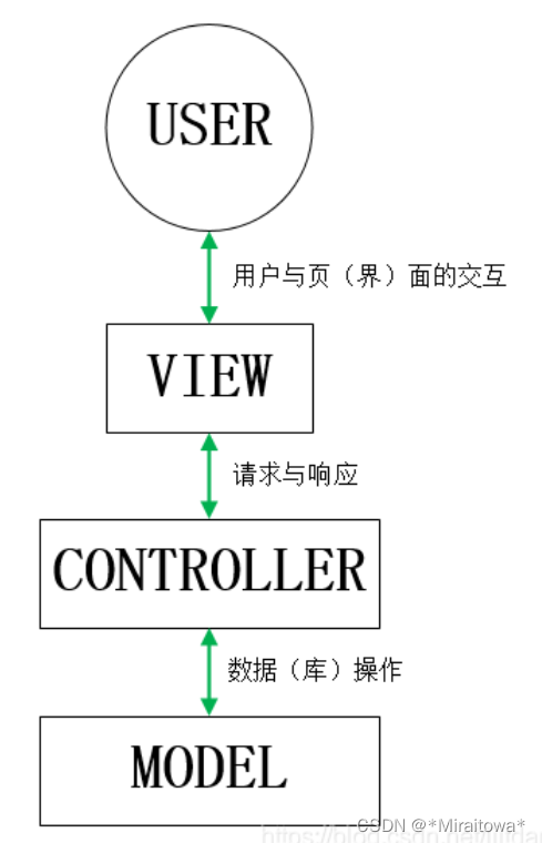 - 控制器(Controller):起到不同层面间的组织作用,用于控制应用程序的流程。它处理事件并作出响应。“事件”包括用户的行为和数据 Model 上的改变。