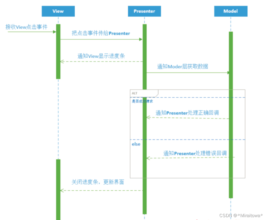 - Presenter: 逻辑控制层,同时持有View和Model对象;(从Model拿数据,应用到UI层,管理UI的状态,响应用户的行为。相当于view和model的传话筒)