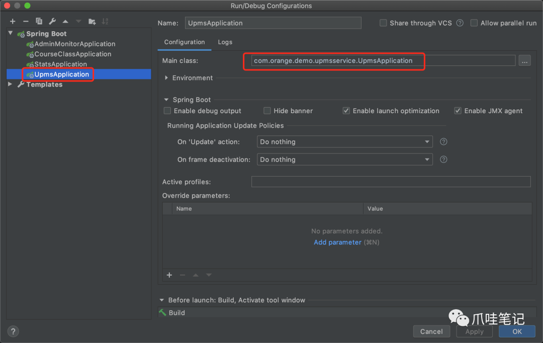 这里仅以upms服务为例。在开发环境中,为每个微服务启动项配置main class,下图为IntelliJ IDEA中的配置截图,配置后点击Debug/Run按钮即可启动。