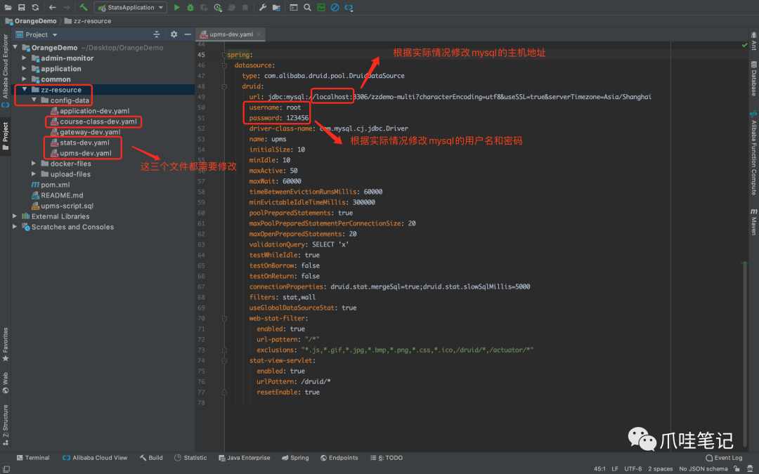 进入工程目录下的 zz-resource/config-data/ 子目录,修改和数据库相关的配置,具体操作详见下图及文字注释。