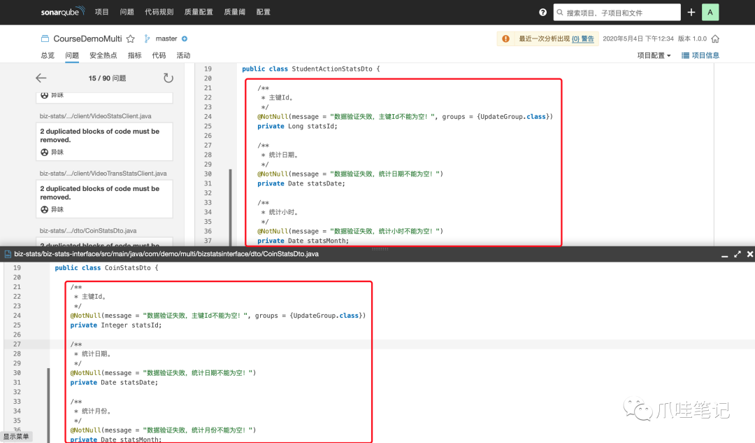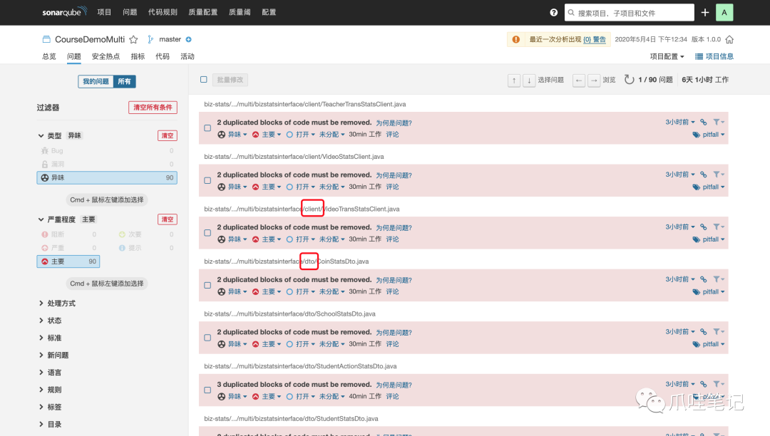 有气味代码共90处,其中85处为DTO、Model、常量字典、RPC接口等定义出现重复名称所致,均与模拟实际业务有关。