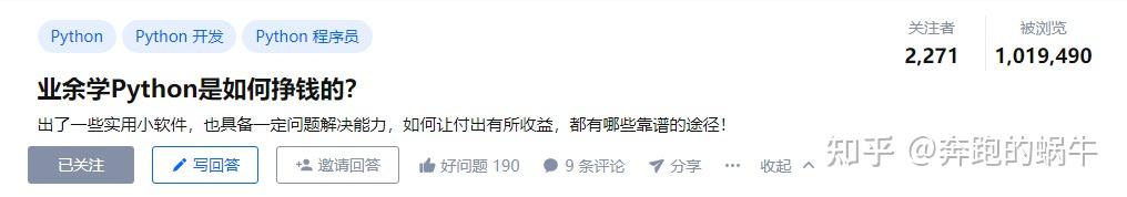 知乎关注的这条帖子浏览量已经上百万了,往往春节后,都会迎来Python兼职接单的高潮期,近段时间各行业对爬虫类和数据分类的需求量也在增加,知乎询问Python技术变现 & 兼职接单的贴子更是一搜一大把。