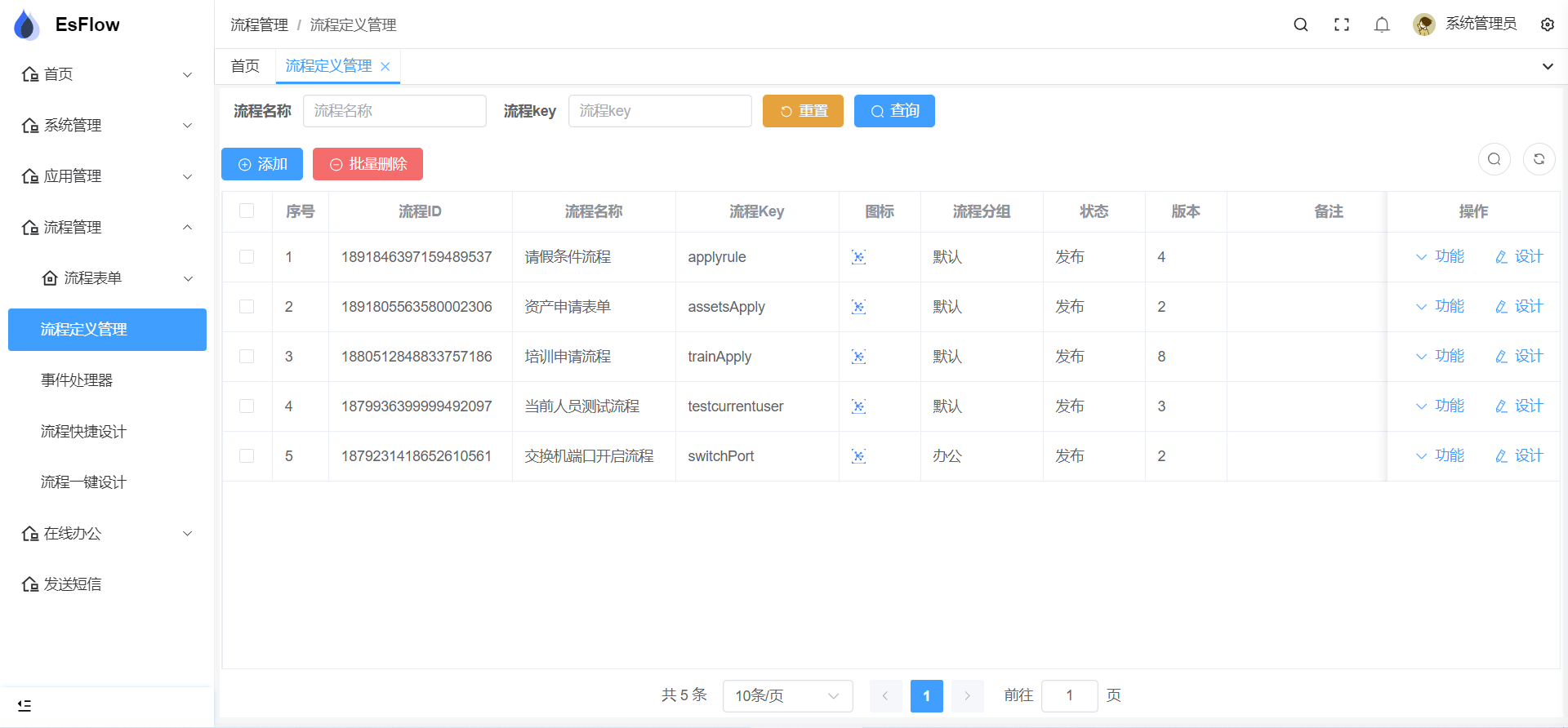 esflow是一款国产自研工作流引擎,其数据库结构简洁(只有8张表),采用json存储流程设计数据和流程表单设计数据,支持中国式流程办理方式,如退回、跳转、驳回、前加签、后加签等。采用主流技术框架,组件独立,可扩展,全程无需写一行代码即可搭建企业级业务流程平台。
