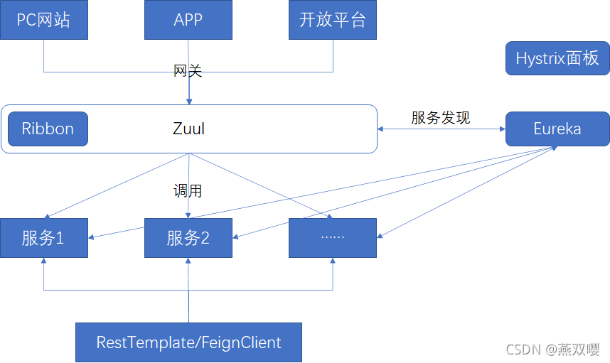 - RestTemplace 和 FeignClient 使用简单的服务调用的方法调用服务1、服务2等。