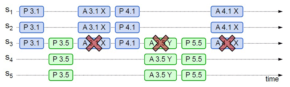 【情况3】当然,另外一种可能的结果是 S5提案时 Promise 应答中并未包含批准过 X 的决策节点,譬如应答 S5 提案时,节点 S1 已经批准了 X,节点 S2;S3未批准但返回了 Promise 应答,此时 S5以更大的提案 ID 获得了 S3、S4、S5的 Promise,这三个节点均未批准过任何值,那么 S3将不会再接收来自 S1的 Accept 请求,因为它的提案 ID 已经不是最大的了,这三个节点将批准 Y 的取值,整个系统最终会对“取值为 Y”达成一致。