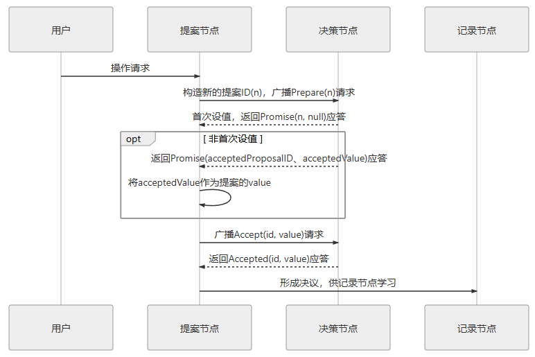 - 应答:不违背以前作出的承诺的前提下,回复已经批准过的提案中 ID 最大的那个提案所设定的值和提案 ID,如果该值从来没有被任何提案设定过,则返回空值。如果违反此前做出的承诺,即收到的提案 ID 并不是决策节点收到过的最大的,那允许直接对此 Prepare 请求不予理会。