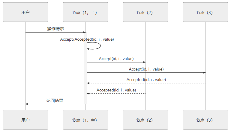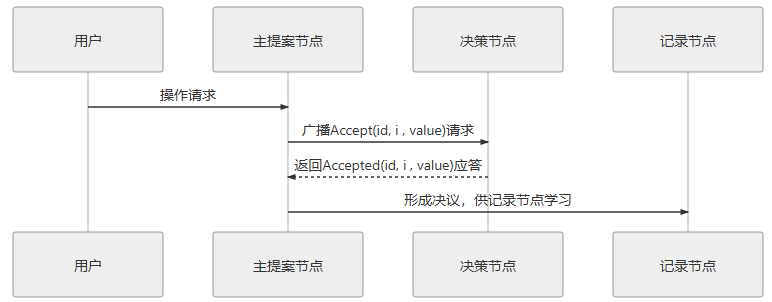 - 接受:当每一个决策节点收到 Accept 请求时,都会在不违背以前作出的承诺的前提下,接收并持久化对当前提案 ID 和提案附带的值。如果违反此前做出的承诺,即收到的提案 ID 并不是决策节点收到过的最大的,那允许直接对此 Accept 请求不予理会。