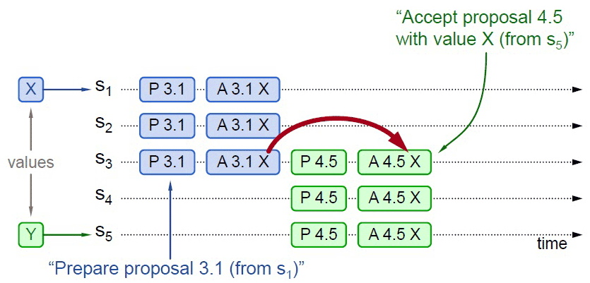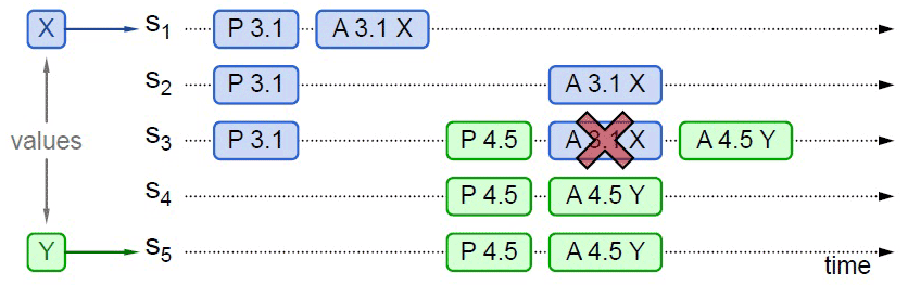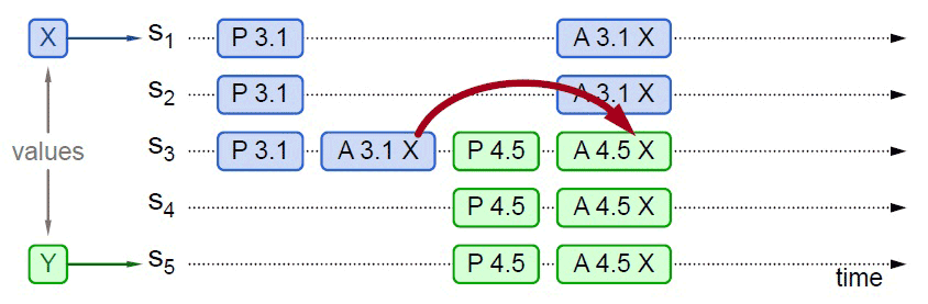 【工作实例】假设一个分布式系统有五个节点,分别命名为 S1、S2、S3、S4、S5。全部节点都同时扮演着提案节点和决策节点的身份。此时,有两个并发的请求分别希望将同一个值分别设定为 X(由 S1作为提案节点提出)和 Y(由 S5作为提案节点提出),以 P 代表准备阶段,以 A 代表批准阶段。