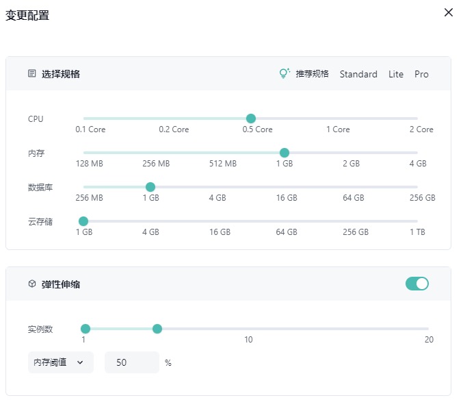 得益于同门的 Sealos 等项目和 Laf 在云计算方面的深耕,Laf 可以一键配置应用规格和弹性伸缩。