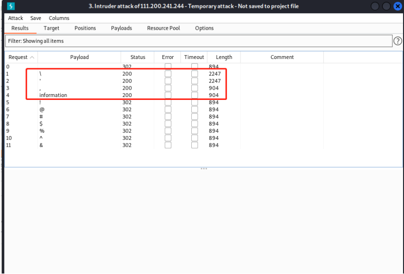 在注入前我们先fuzz测试一下有什么被过滤了