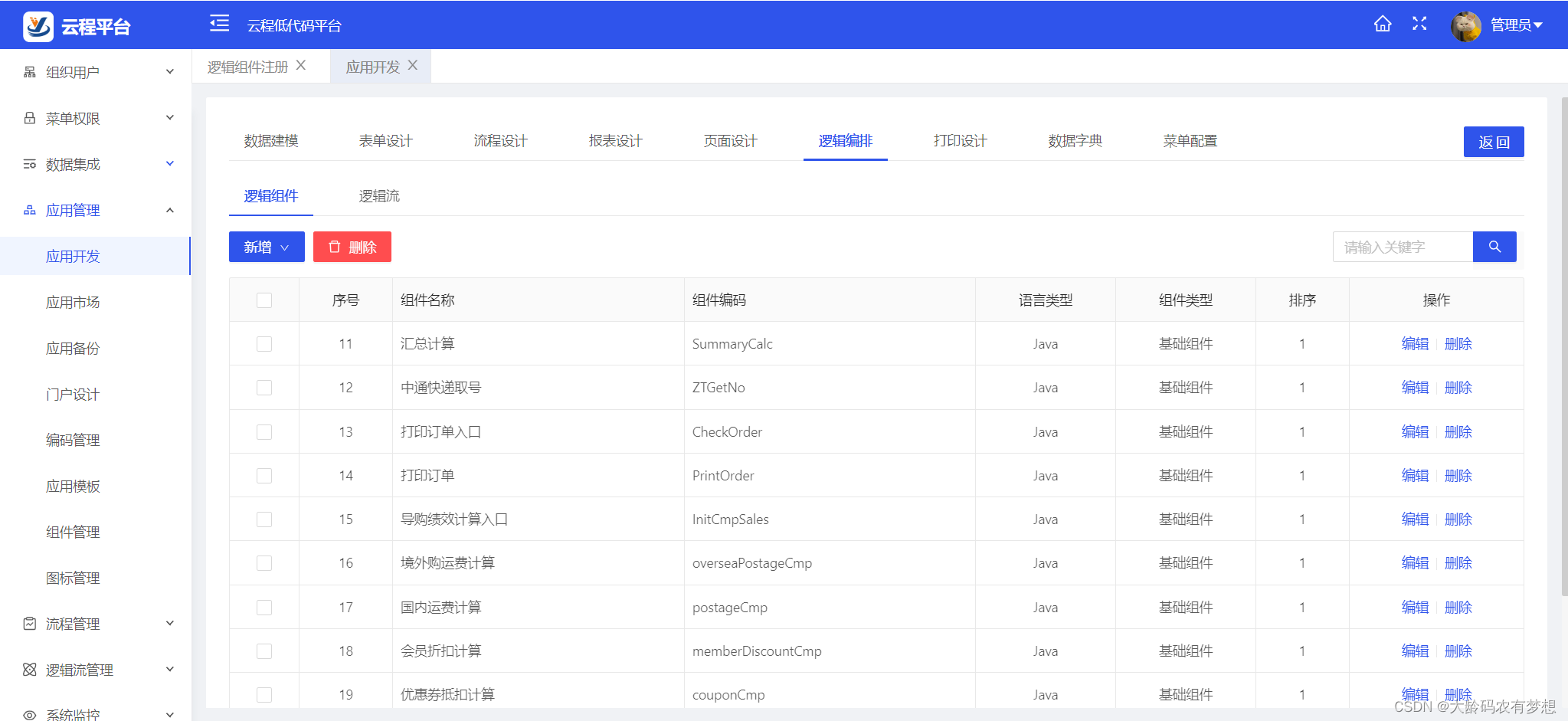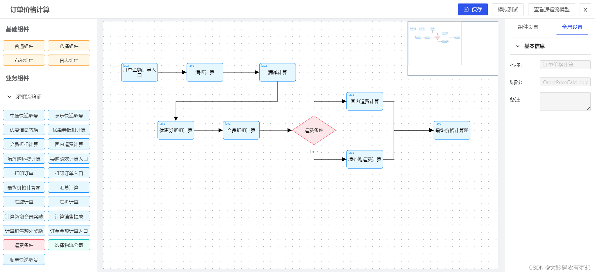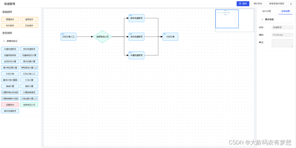 2)逻辑流设计编排:通过设计器对组件的执行顺序、规则进行编排,形成可执行的逻辑流模型。