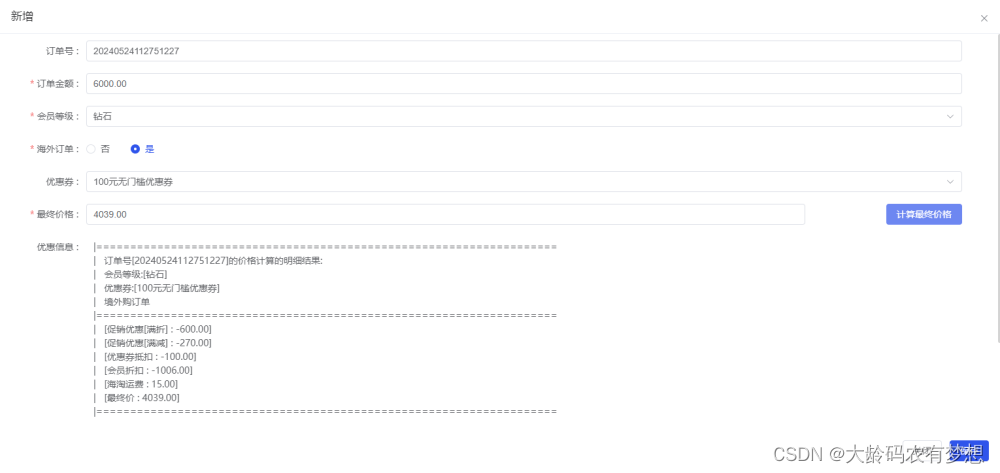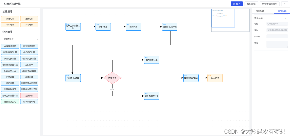 逻辑设计(规则设计),可以将复杂且多变的业务规则从硬编码中解耦,封装成独立、可复用的业务组件,通过可视化规则设计器按业务需求编排业务组件的执行逻辑,使得业务规则的变更无需修改项目代码、不用重启服务器就可以在线上环境立即生效,实现灵活应对业务需求变化。比如说订单价格计算,有折扣、满减、促销券、会员等级,不同会员等级在不同促销场景下(618、双11等),计算价格的规则是不一样的,这种需求就可以进行规则编排,面对业务需求快速变化,能够及时调整应对。