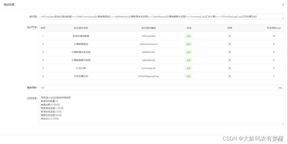 在进行模拟测试时,可以填写或修改逻辑流的入参变量。填写好后点击右下角测试按钮,即可展示测试结果。