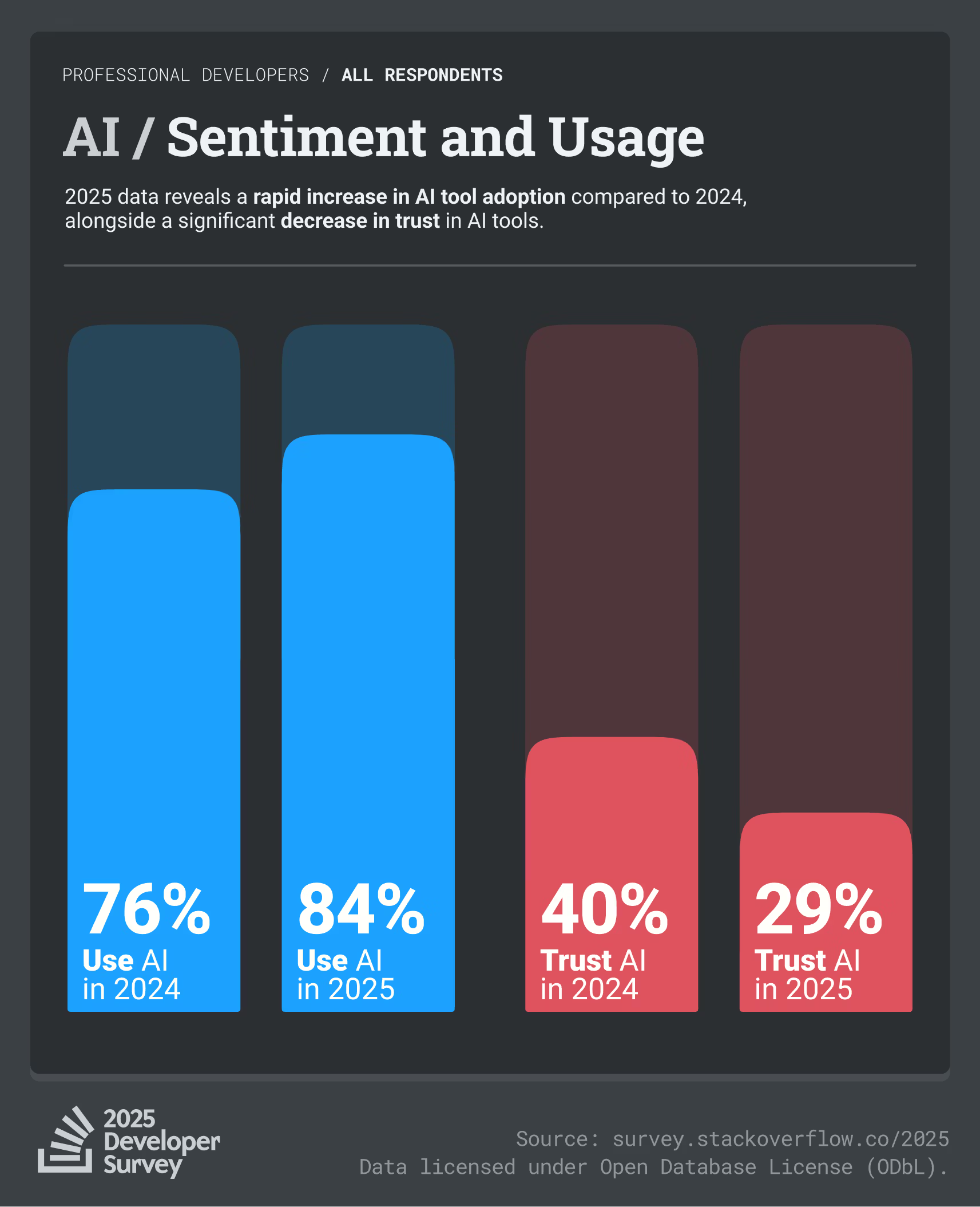 Stack Overflow 调查中表明,尽管 AI 使用率高达 84%,开发者对 AI 输出的信任却处于历史低位,这意味着工程师依然是“质量把关者”。(Stack Overflow Business)