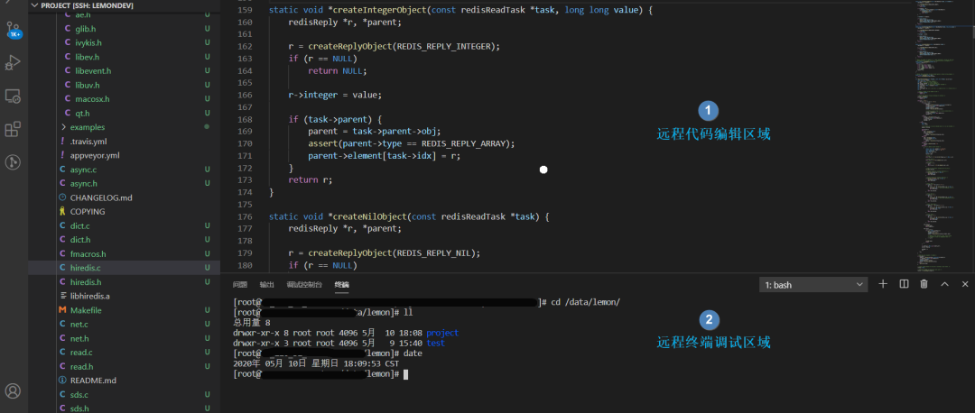 代码编辑与远程终端调试。打开文件编辑的是云服务器的文件,同时可以打开云服务终端,直接在终端操作编译或者查看云服务器信息。