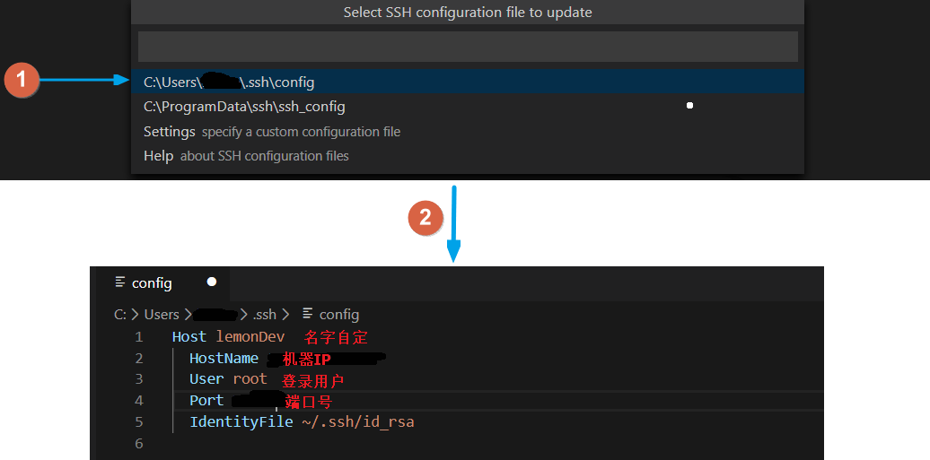 修改 ssh 配置文件,用于登录远程机器,各项含义在图中有说明。