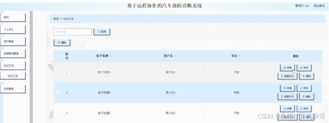 论坛交流;在论坛交流页面中可以对索引,帖子标题用户名,状态等内容进行详情,修改,查看评论和删除操作;如图4-9所示。