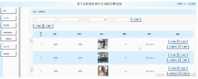 故障案例管理;在故障案例管理页面中可以对索引,名称,类型,图片,视频,日期等内容进行详情,修改,查看评论和删除操作;如图4-8所示。