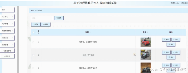 系统管理;在公告资讯页面中可以对索引,标题,图片等内容进行详情,修改和删除操作;还可以对轮播图管理进行详细操作;如图4-10所示。