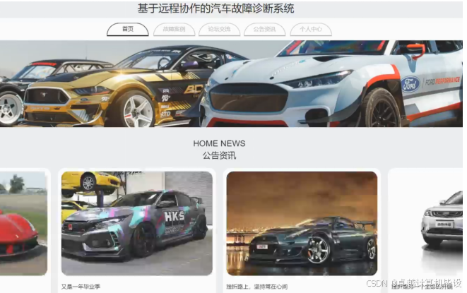 汽车故障诊断系统,在系统首页可以查看首页,故障案例,论坛交流,公告资讯,个人中心等内容,并进行详细操作;如图4-1所示。