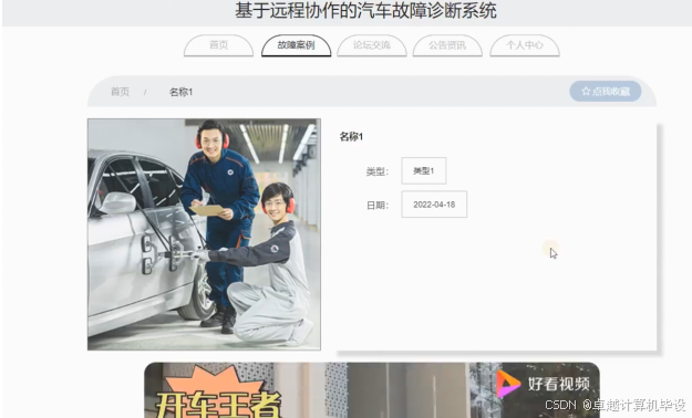 故障案例,在故障案例页面可以查看名称,类型,图片,日期,视频,内容等信息,并进行评论和收藏等操作;如图4-3所示。