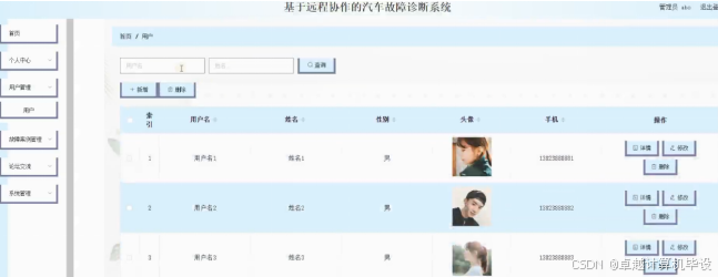 用户管理;在用户管理页面中可以对索引,用户名,姓名,性别,头像,手机等内容进行详情,修改和删除操作;如图4-7所示。