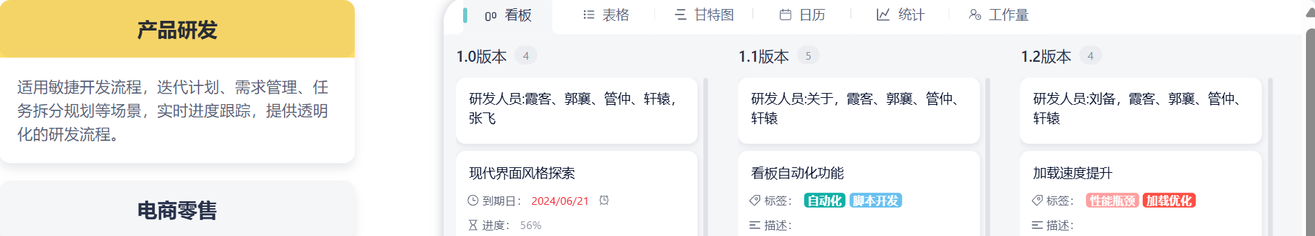 - 零学习成本设计:极简看板+任务卡片交互,新团队15分钟快速上手