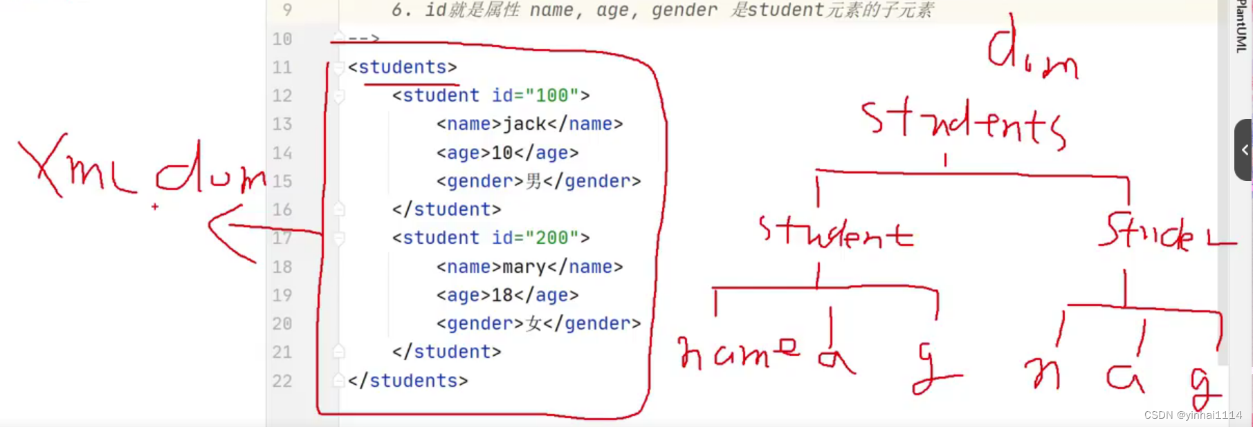 1.需求:使用idea创建students.xml(可拓展标记语言)存储多个学生信息