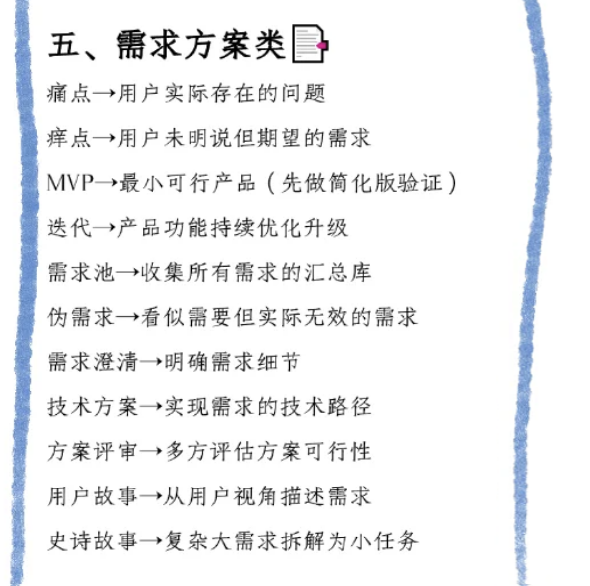 挖掘需求要懂 “痛点”(用户实际问题 )和 “痒点”(用户隐含期望 ),做 “MVP” 最小可行产品验证思路,“迭代” 持续优化功能,“需求池” 汇总需求,过滤 “伪需求”,“需求澄清” 明确细节,“技术方案” 找实现路径,“方案评审” 多方评估,用 “用户故事”“史诗故事” 拆解、描述需求,让方案更贴用户 。
