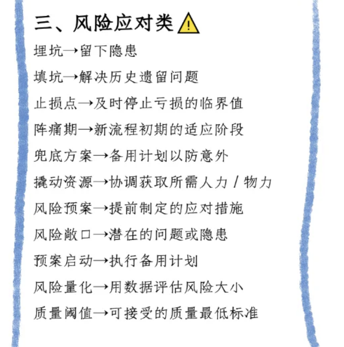 项目里风险如暗礁,“埋坑” 会留隐患,“填坑” 解决历史问题;“止损点” 是停止亏损临界值,新流程有 “阵痛期”,得提前准备 “兜底方案”,灵活 “撬动资源” 应对意外,“风险预案” 是提前措施,识别 “风险敞口”,必要时 “预案启动”,“风险量化” 用数据评估,“质量阈值” 把控质量底线 。