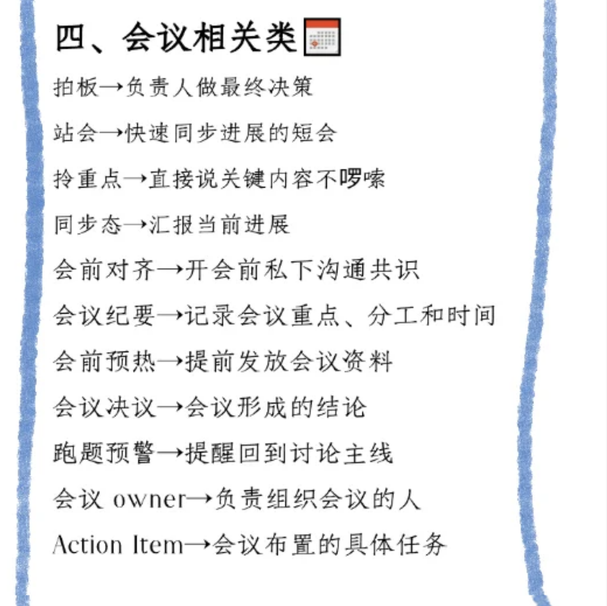会议是项目决策阵地,“拍板” 是负责人定决策;“站会” 快速同步进展,“拎重点” 抓关键内容;“同步态” 汇报进度,“会前对齐” 私下沟通共识,“会议纪要” 记录重点、分工和时间,“会前预热” 提前发资料,“会议决议” 是结论,“跑题预警” 拉回主线,“会议 owner” 组织会议,“Action Item” 明确任务,让会议高效产出 。