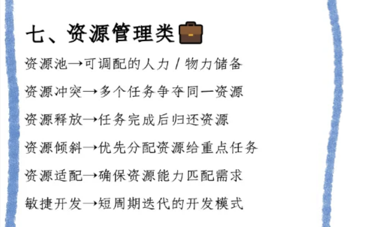 资源是项目燃料,“资源池” 储备人力物力,“资源冲突” 是多任务争资源,需协调;“资源释放” 是任务完成后归还,“资源倾斜” 优先给重点任务,“资源适配” 确保能力匹配,“敏捷开发” 短周期迭代,灵活响应需求 。