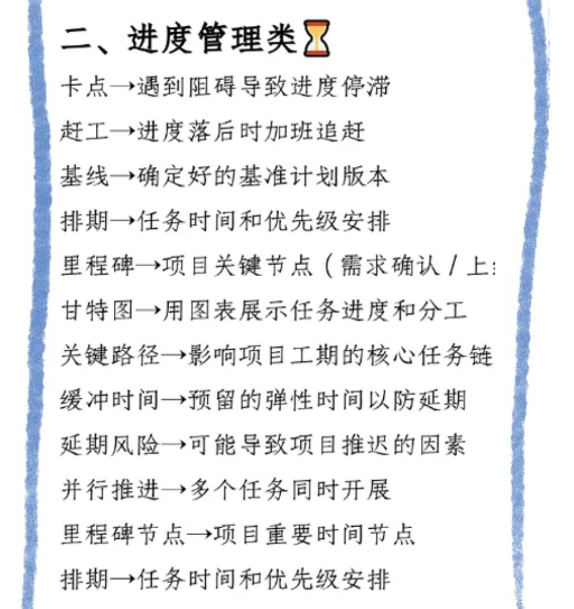 项目进度像列车时刻表,“卡点” 是阻碍进度的绊脚石,需快速识别解决;进度落后时 “赶工” 加班追赶,要平衡好质量与时间。“基线” 是基准计划,“排期” 安排任务时间和优先级,“里程碑”(含里程碑节点 )是关键节点,用 “甘特图” 直观展示进度分工超方便,找到 “关键路径” 聚焦核心任务链,预留 “缓冲时间” 应对延期风险,“并行推进” 多个任务,提升效率 。