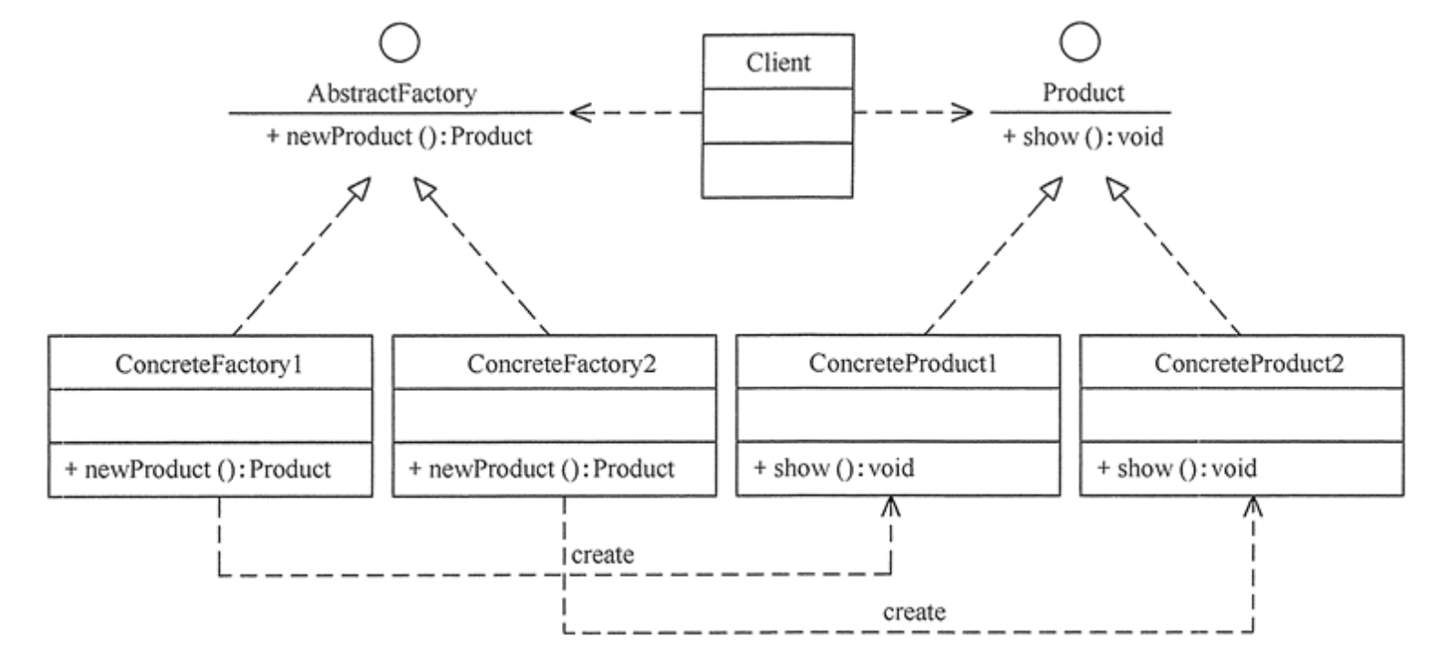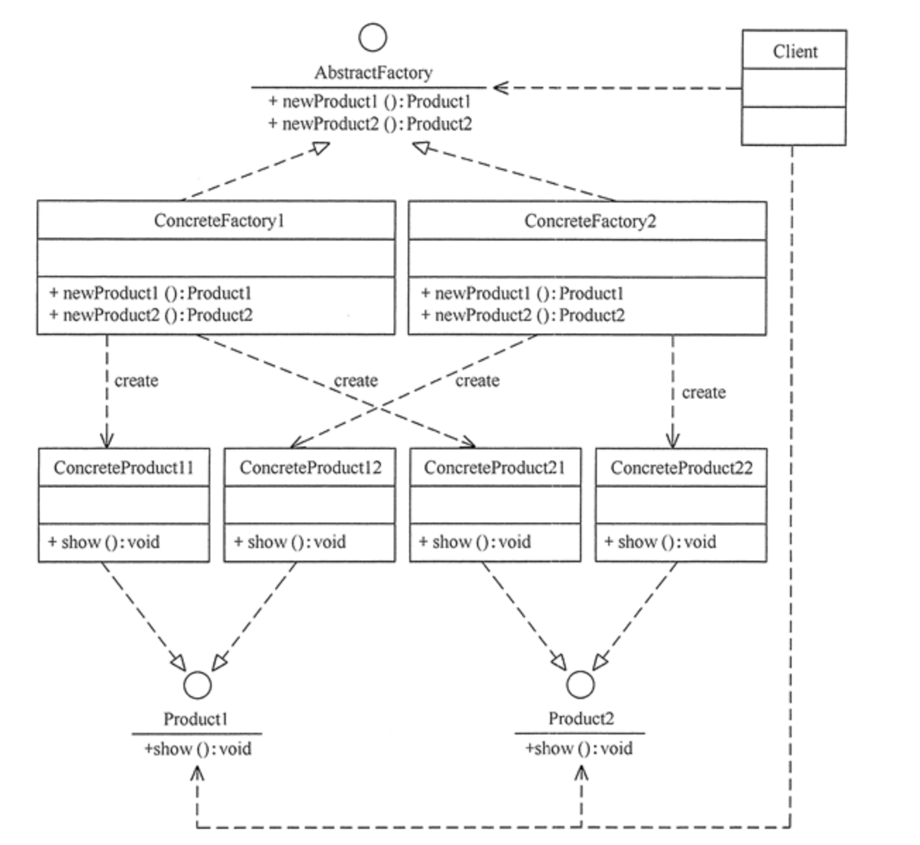抽象工厂(AbstractFactory):提供了创建产品的接口,调用方通过它访问具体工厂的工厂方法来创建产品