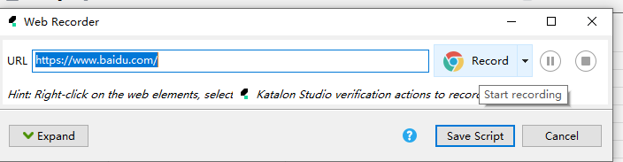 - 点击工具栏的 Record 按钮(红色圆点)→ 选择浏览器(如 Chrome)。在URL中输入https://www.baidu.com