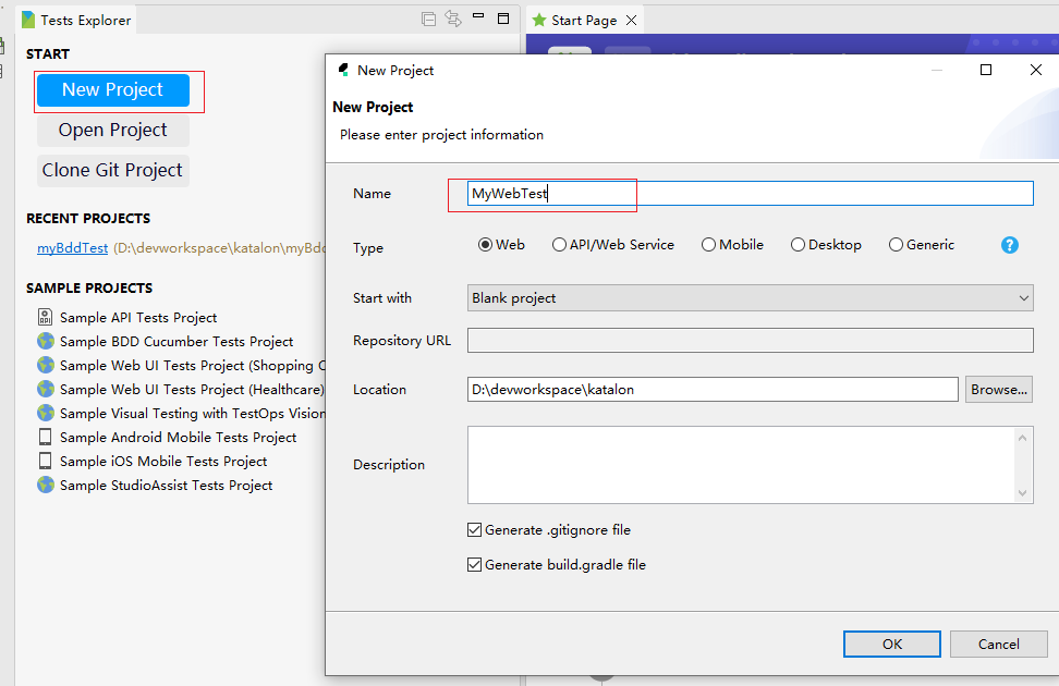 点击New Project -> 输入项目名 MyWebTest ,点击OK 按钮