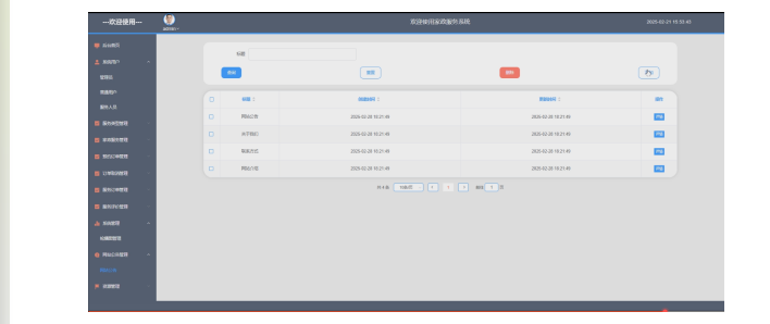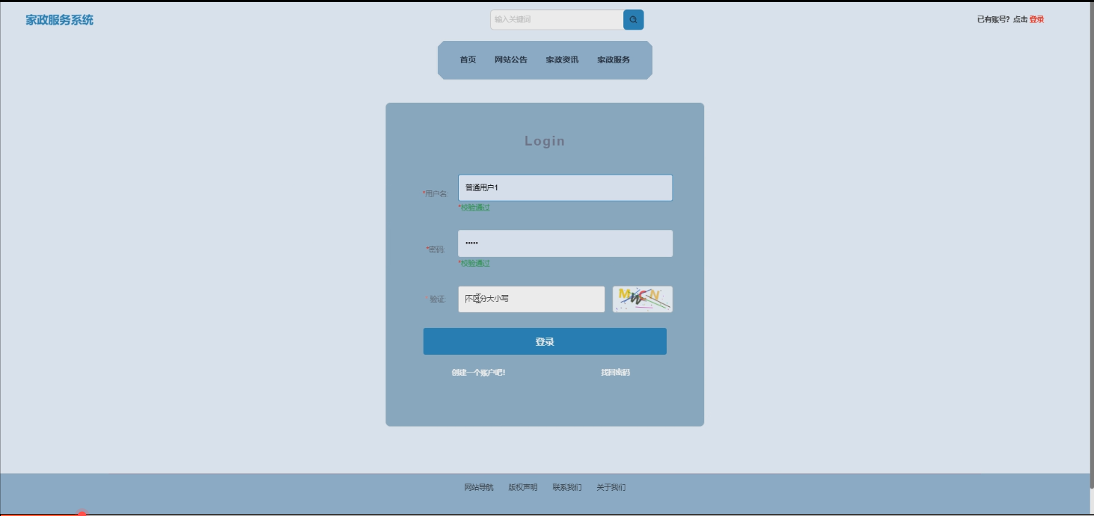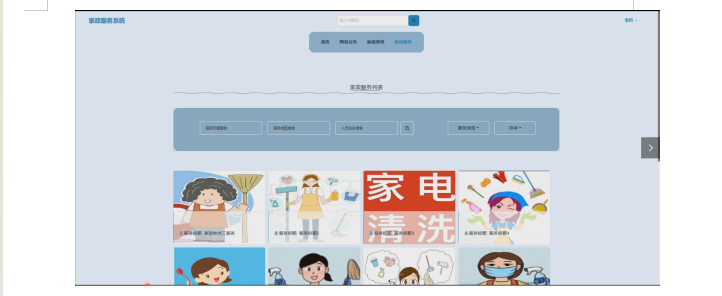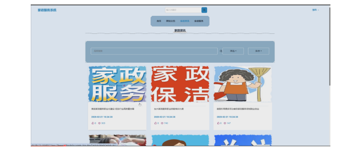 首页:普通用户登录后可访问系统的首页,首页展示系统的主要功能入口、推荐的家政服务、最新的网站公告和家政资讯,便于用户快速找到所需信息。