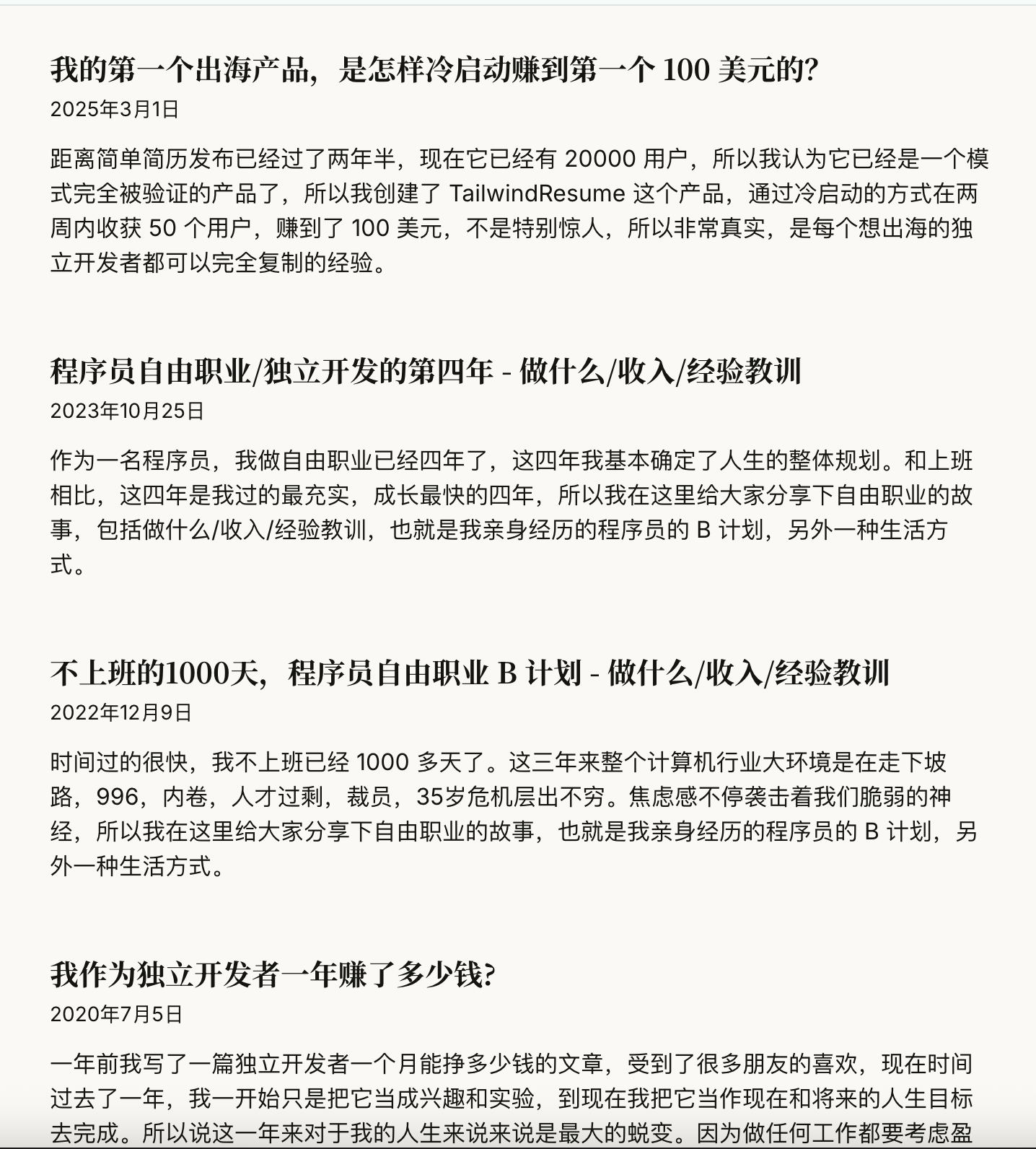 最近,Viking还分享了《我的第一个出海产品,是怎样冷启动赚到第一个100美元的?》,详细介绍了TailwindResume如何在两周内收获50个用户,赚到100美元的真实经历。这种实操性的分享对于想要产品出海的独立开发者特别有参考价值。