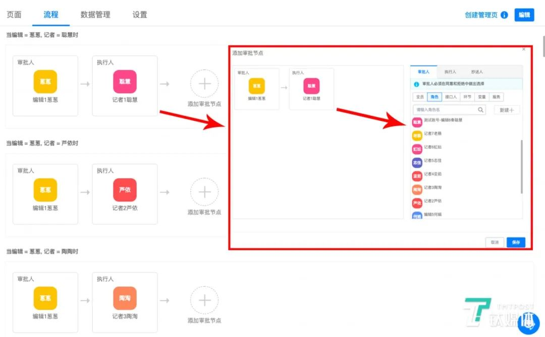 这里遇到了坎儿。如果要简单的场景,可能就是设定一两个审批人,大家套用一套审批规则就行。但在我的实际工作中,由于编辑(审批人)是多个,记者(实际执行人)也是多个,所以这里就出现了排列组合,基础的规则已经无法解决了。