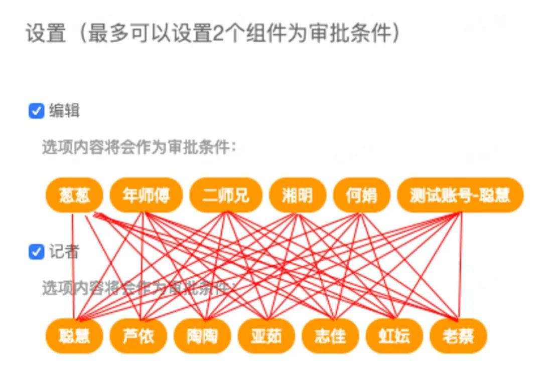 两个审批条件选中,系统会自动进入“如果编辑是A1,记者是A2,就执行A3”的逻辑,大概就是这样: