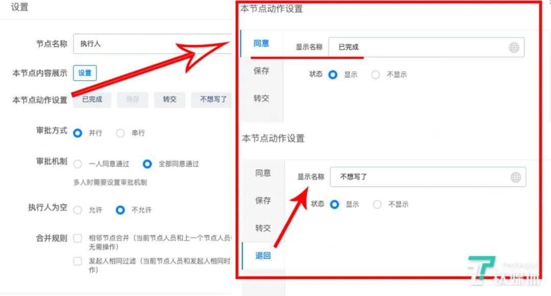 对每一个可能审批节点的定义,是花时间最久的地方。在第一部分提到的两个看起来是为选题业务设置的两个“已完成”、“不想写了”两个按钮,也是手动设置的,他们在后台长这样: