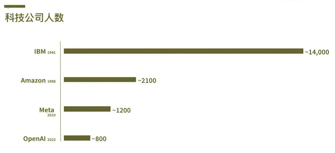 1941年,IBM达到十亿美元收入,公司人数有1万4千人;1998年,亚马逊达成年收入十亿美元时,公司有2100名员工;2010 年Meta达成这一成就,公司有1200人,而2022年,OpenAI在仅有800人的情况下,完成了这一成就。